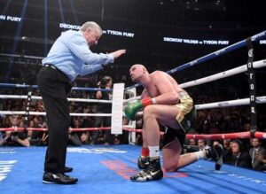Early in the final round, Wilder stung Fury with a fierce straight right followed by a crushing left hook to drop Fury and made his eyes roll in the back of his head. No one expected what happened next. Arms sprawled across the ring, like a possessed zombie, Fury’s eyes widened and he sat straight up, rising from the dead.