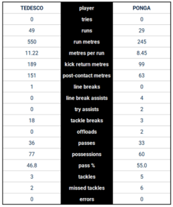 Both Tedesco and Ponga are vastly different fullbacks; Tedesco’s involvement is nonstop and creates opportunities through sheer effort, whilst Ponga tends to pick his moments and use his combination of speed, footwork, and ball-playing to make life easier for his outside men.
